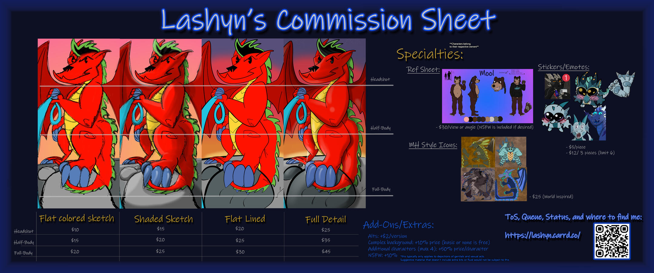 - Process: First, you will receive a sketch. If you want big changes, ask for them here. If you want me to re-do the sketch, please ask for that as well! Once approved, I will line it, color, then shade it (if applicable), and provide WIPs. Don't be afraid to ask for changes along the way. I want everything to be correct for you. However, I will only do changes for missing character design or instructions outside of the sketch phase (missing features, colors, markings, accessories, etc). If it's a limitation of my skill or style, there's not much I can do. Be sure you want to commission me!! You will get a full resolution image without watermark, and a half-res with the watermark. The latter is for posting, the former is for your use only